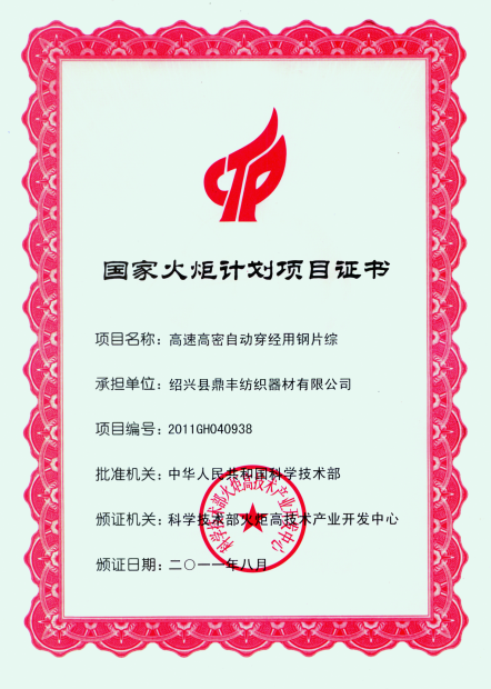 浙江鼎豐紡織器材有限公司始建于1986年,是一家專業(yè)生產(chǎn)各類無(wú)梭織機(jī)用鋼筘:噴氣筘、噴水筘、劍桿筘、其他類型鋼筘;鋁合金綜框、鋼片綜、停經(jīng)片、經(jīng)軸、織軸、卷布輥等產(chǎn)品及配件的民營(yíng)企業(yè)。